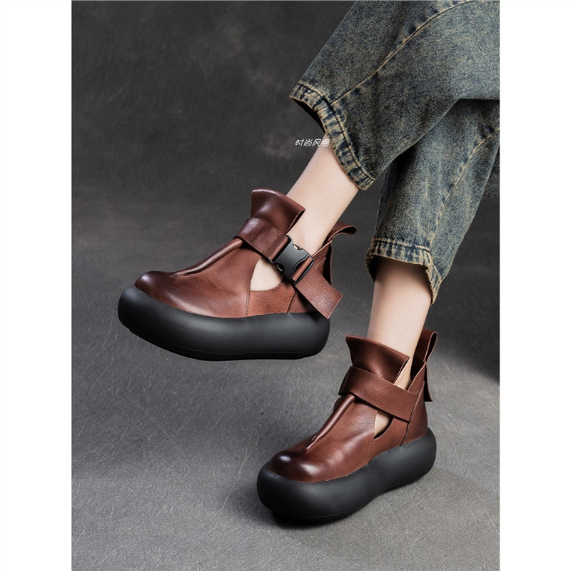 2024新型の厚い底の本革の女性サンダルの透かし彫りの復古風のベルトは頭の層の牛革の靴の丸い頭を掛けます。