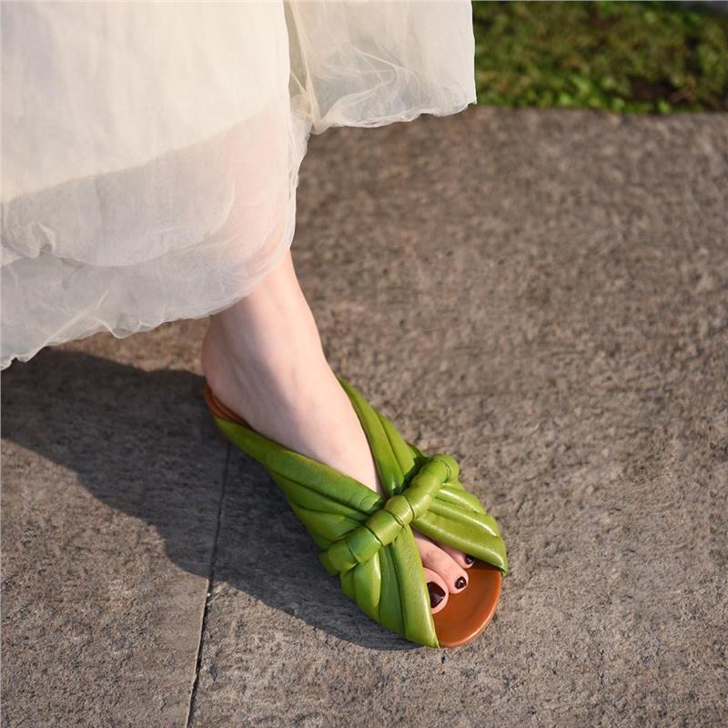 オリジナルのフラットスリッパの女性は夏に手作りのレトロなスリッパを履いています。
