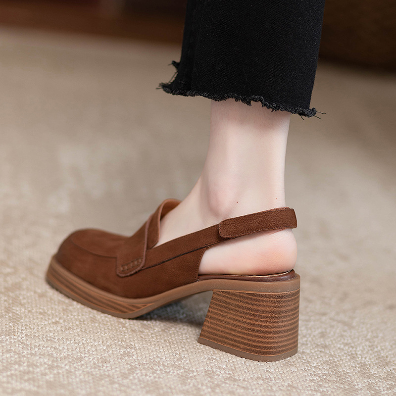 巨方便包頭太とサンダル女2024新型レトロ真皮厚い底丸首後空マジックテープハイヒール