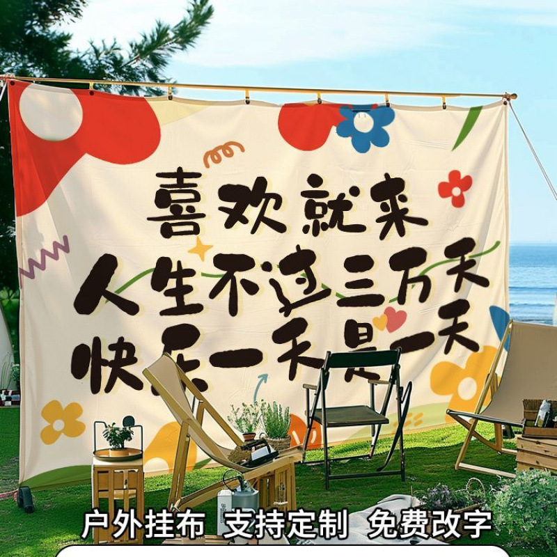 アウトドアキャンプアウトドア趣味文字市創意背景布網赤キャンプ場個性的な雰囲気感にタペストリーを配置します。