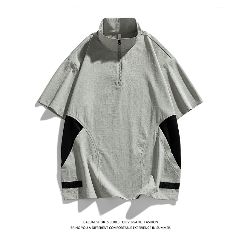 氷糸立襟半胸ファスナーメンズ半袖tシャツ夏薄いポロシャツスポーツカジュアル半袖