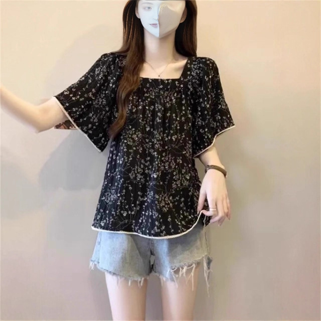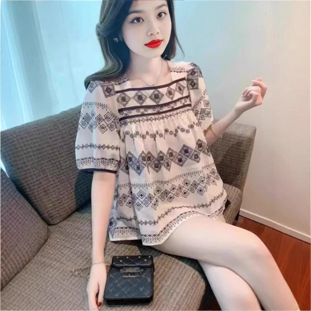 ファッショナブルな年齢を減らす夏の新しいレトロなプリント気質スクエアカラーシャツレディースカジュアルお腹カバールーズパフスリーブトップ