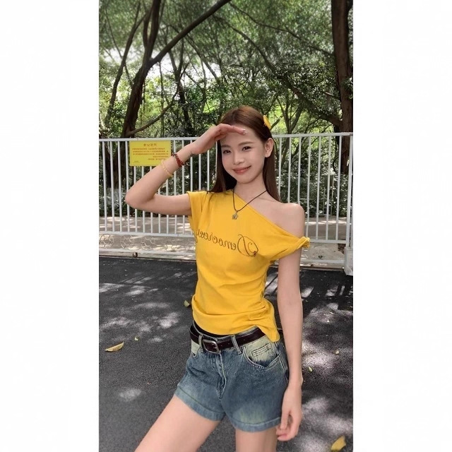 夏デザインスリムホットガール痩身シンプルトップ2025新しい韓国スタイル斜め襟オフショルダー気質Tシャツ女性用