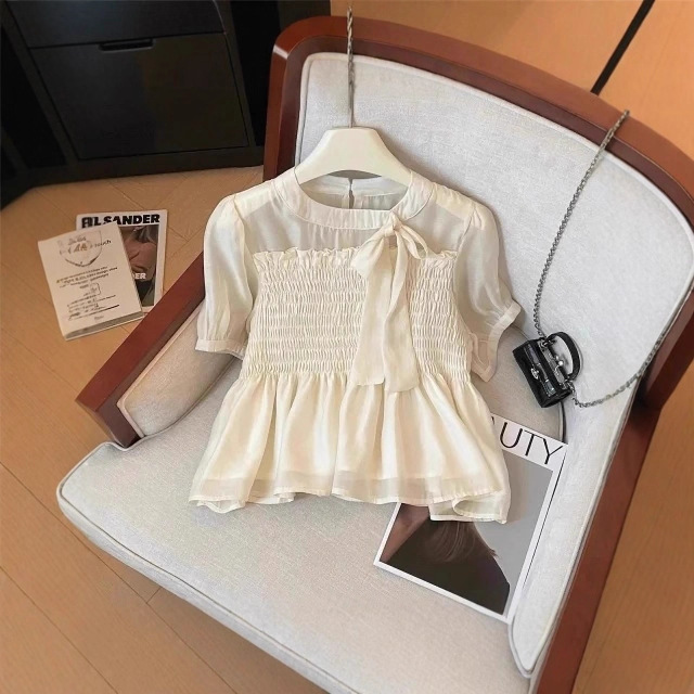 女性のための紫色の半袖シャツ 2025 年夏蝶ネクタイウエストベビードールシャツシックなトップ春と夏の新しいスタイル