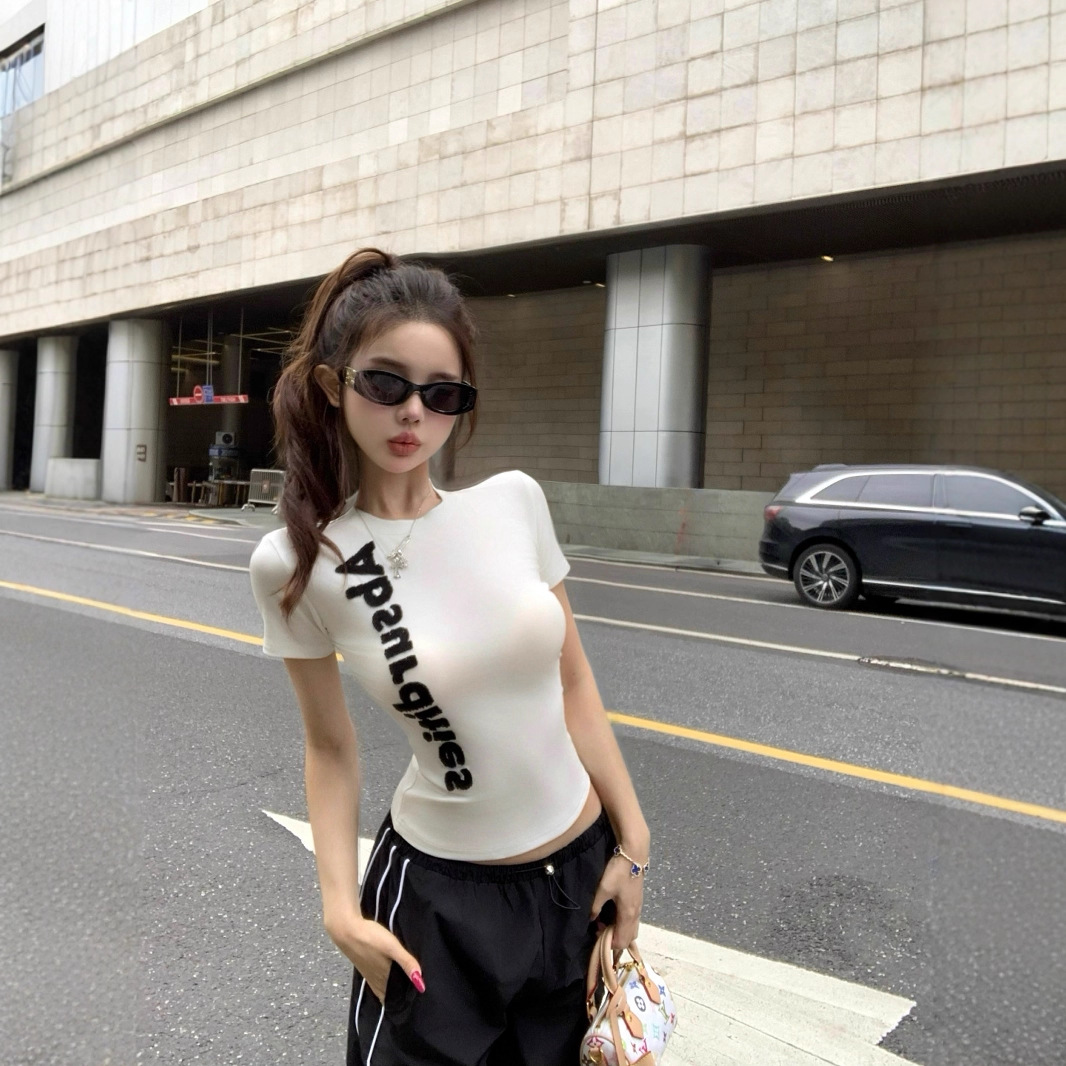 ホットガールホワイトショルダー半袖Tシャツレディースサマーデザインレターショートスタイル超見栄えの良いユニークで美しいサマートップ
