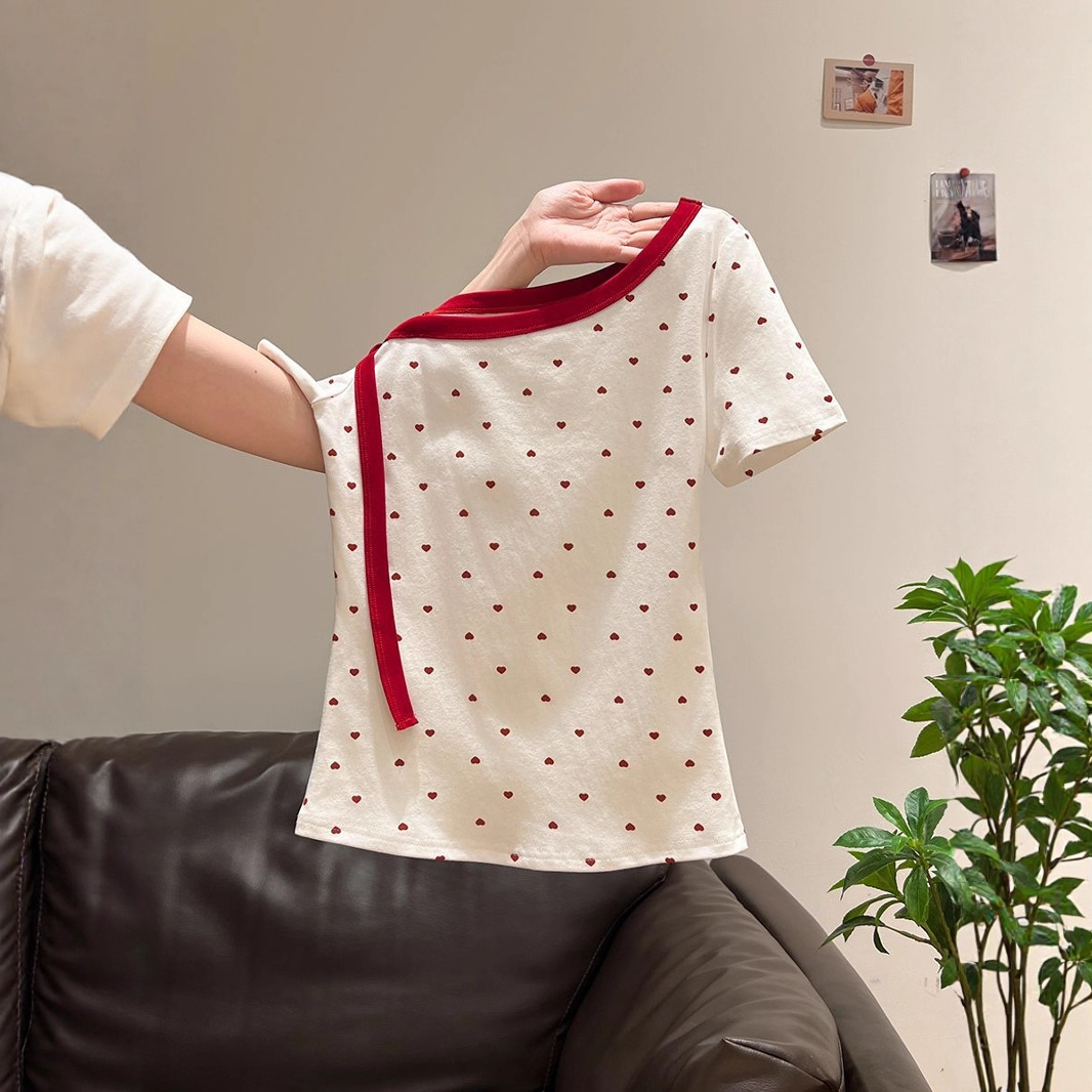 2025 ラブプリントホワイトオフショルダー半袖 Tシャツ女性の夏の新しいストラップデザインスリム甘いスパイシートップ