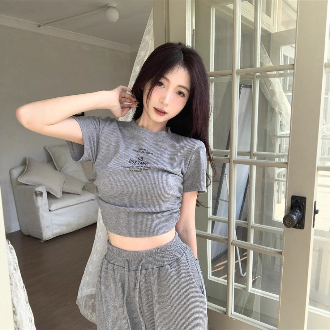 ピュアセクシーグレースーツ女性用、甘くておしゃれなホットガール、巾着半袖トップス、ストレートワイドレッグパンツ2点セット