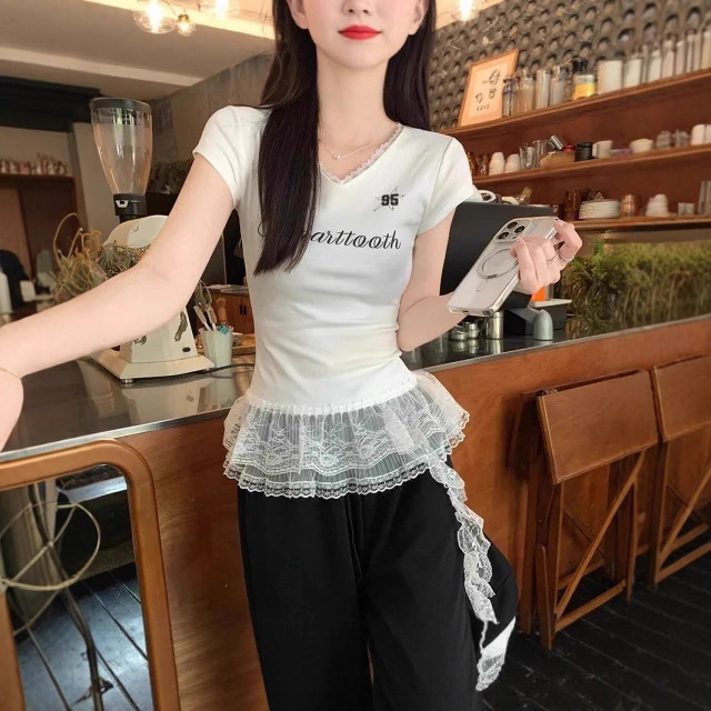 ホワイトレースステッチvネック右肩半袖tシャツレディース夏新作スリムフィットアメリカンホットガールショートトップ