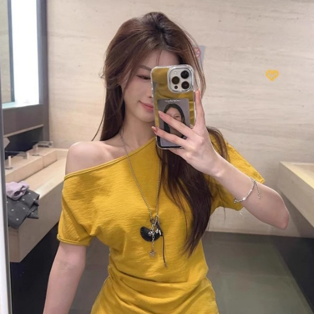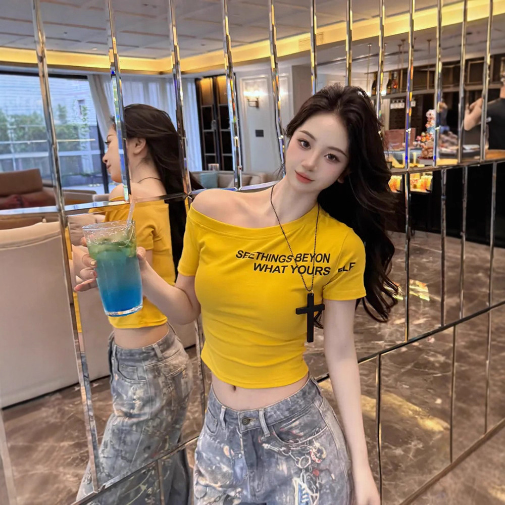ドーパミンイエローレタープリント斜め肩半袖Tシャツレディース夏デザインストラップウエストオフショルダートップトレンディ