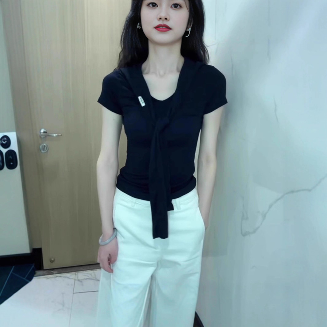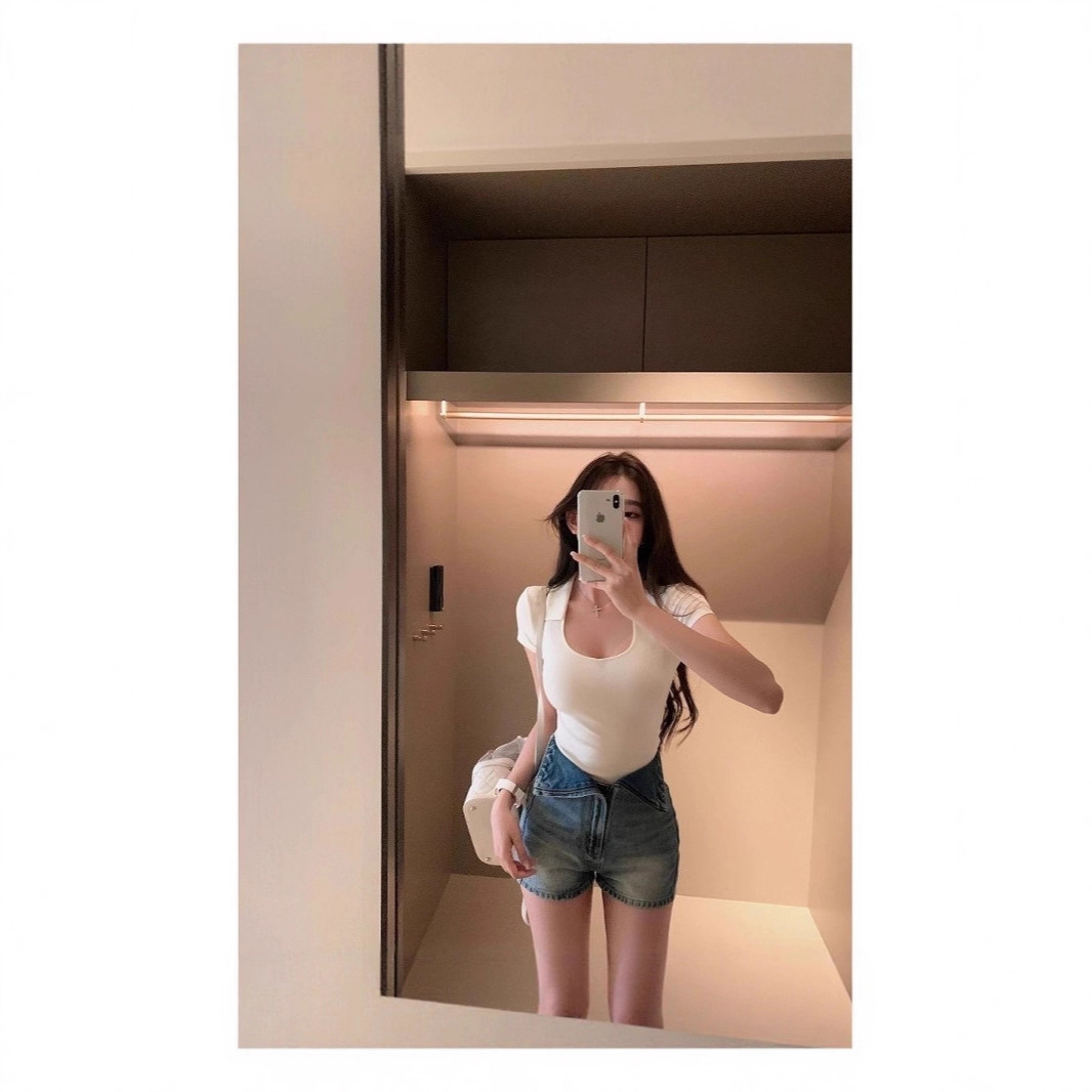 Pure Desire U字型スクエアネックTシャツレディース夏カーブヘムホワイトホットガールセクシータイトスリム半袖ショルダートップ