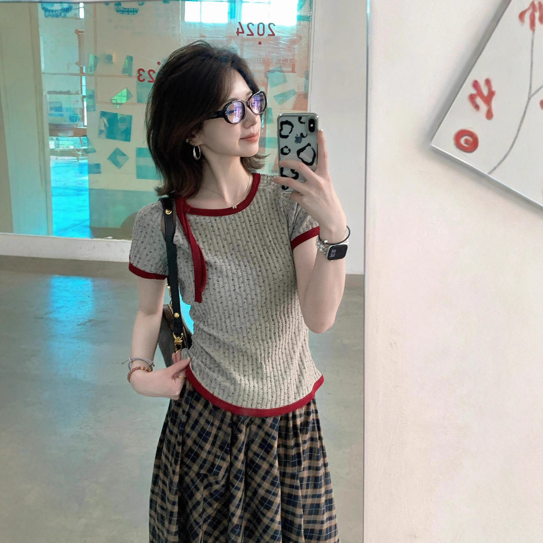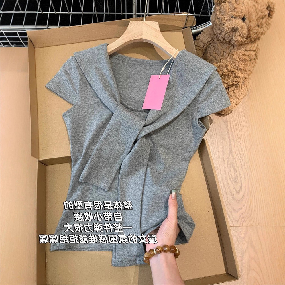 日本ファッションインストラップ偽ツーピース半袖Tシャツレディース新作夏スリムフィットグレーショルダーショートトップ