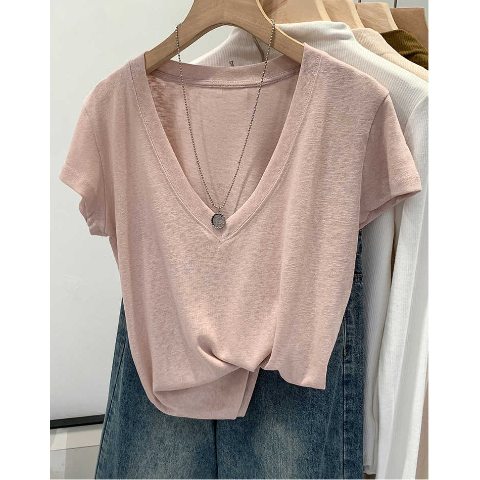 韓国ニッチVネックショルダー半袖Tシャツレディース2025夏新作スリムフィット純粋な欲望スタイルボトリングシャツトップ