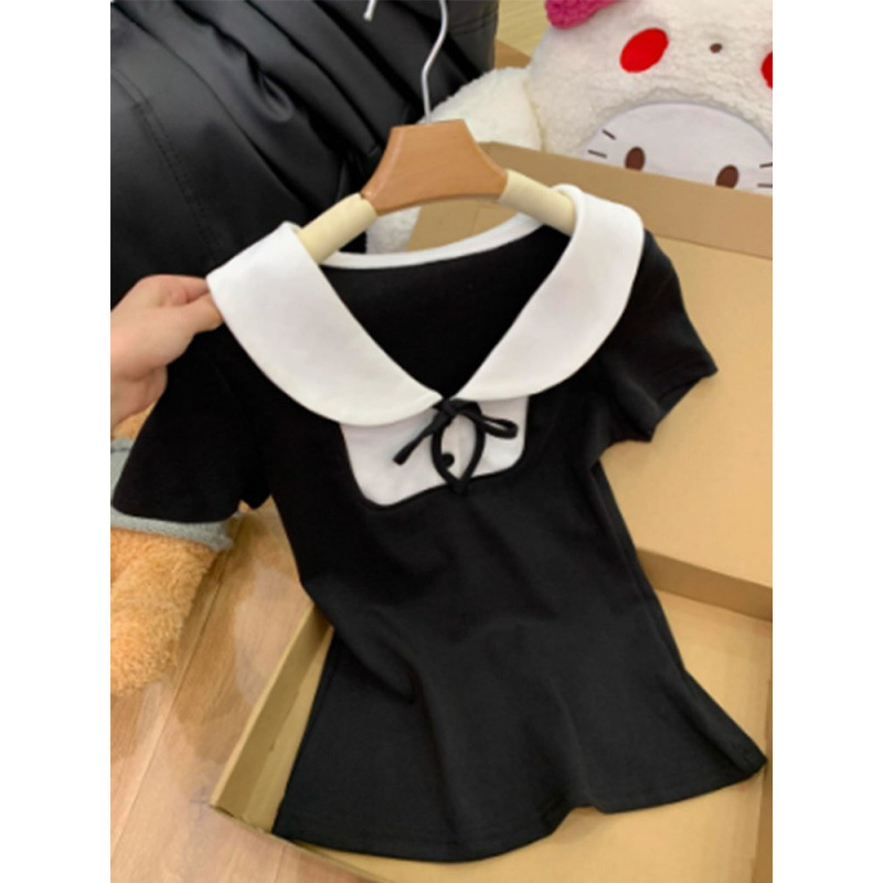 カウンター撤去!一流ブランドの女性用黒フェイクツーピーストップス春夏新作半袖ストラップデザインショートスタイル