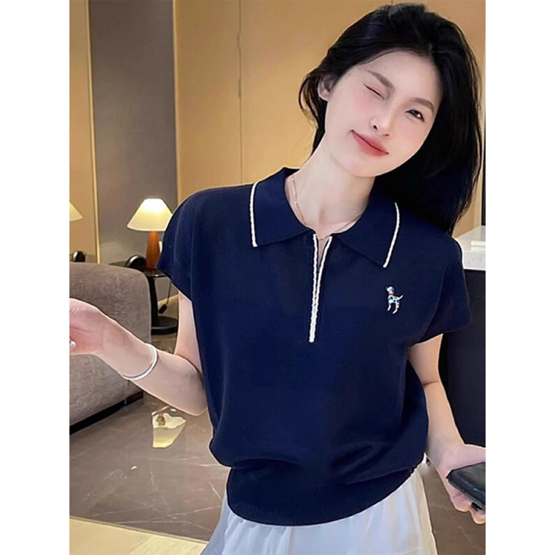 ネイビーブルーポロカラーハーフジップショルダー半袖Tシャツレディース夏アイスシルクニット小飛袖ショートトップ薄手