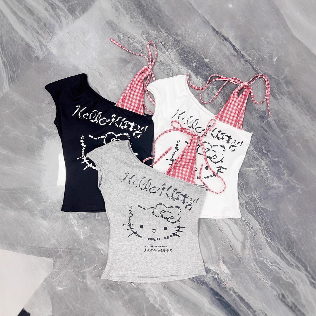 甘いホットガールストラップチェック柄スプライシングキティ猫キャミソール女性の夏の新しい斜め襟オフショルダーセクシーな気質