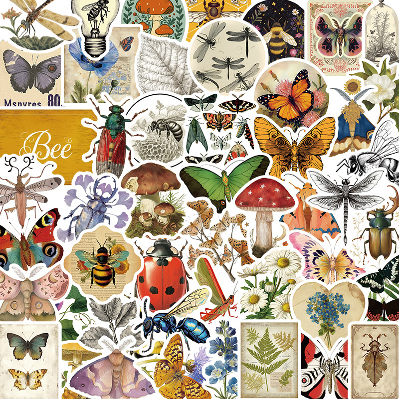 50枚レトロ昆虫学ステッカー植物彩色絵手帳素材携帯電話ノートコップ装飾防水ステッカー