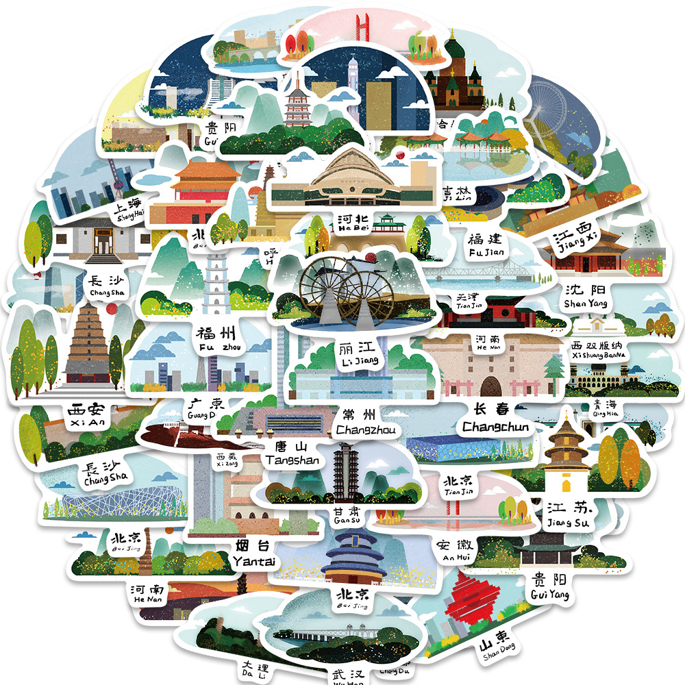 50枚の中国の都市の有名なランドマークの建築の街並みのスーツケースのコンピュータのタブレットの防水のコップは冷蔵庫を飾って絵を貼ります。