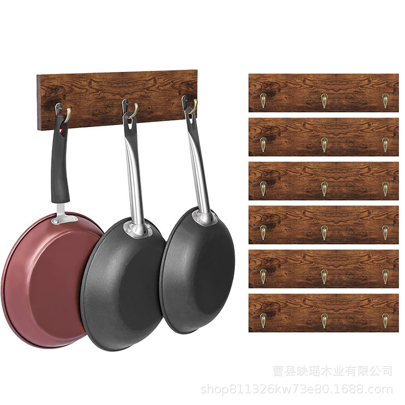 木製壁掛け式フライパンラックキッチン吊り式重鍋ラック3個フック付き木製小さなフライパンラック