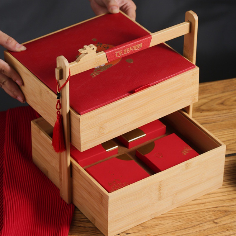 竹製中秋の月餅箱携帯型焼き菓子箱バスケット式二重木製プレゼント月餅包装箱