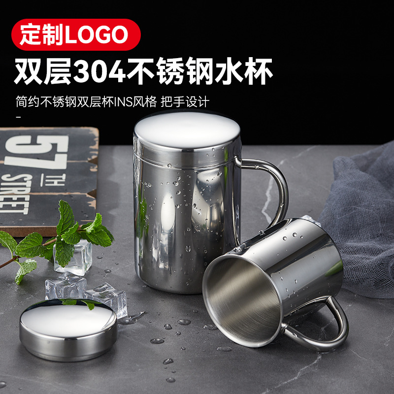 カスタムロゴカップ304ステンレス蓋付き二重コップ断熱幼稚園マグカップハンドル付き