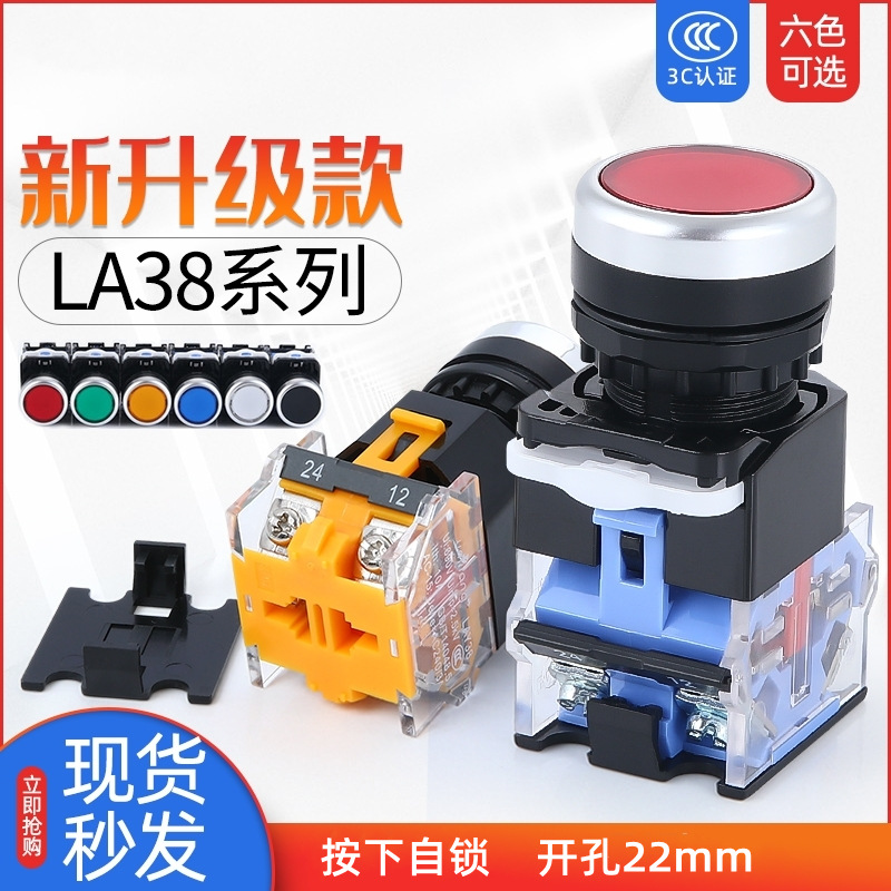 起動ボタンスイッチLA38-11自動リセットセルフロック青殻銀接点赤緑黄色開孔22mm