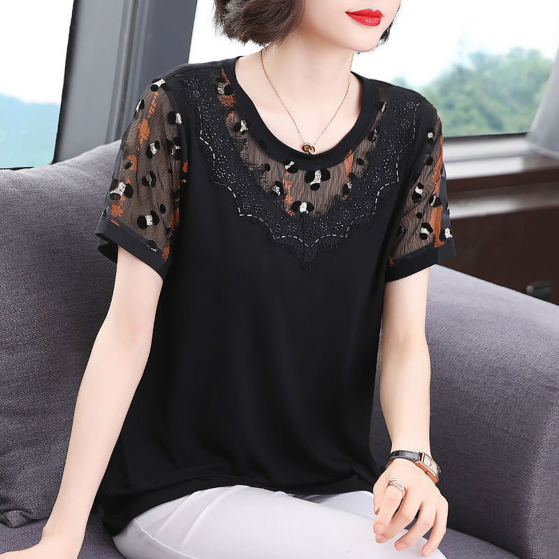 大きいサイズの綿のシャツの女性の半袖の新型の夏服の女性の中年のお母さんの黒色のネットの糸はゆったりしている上着の女性をつなぎ合わせます。