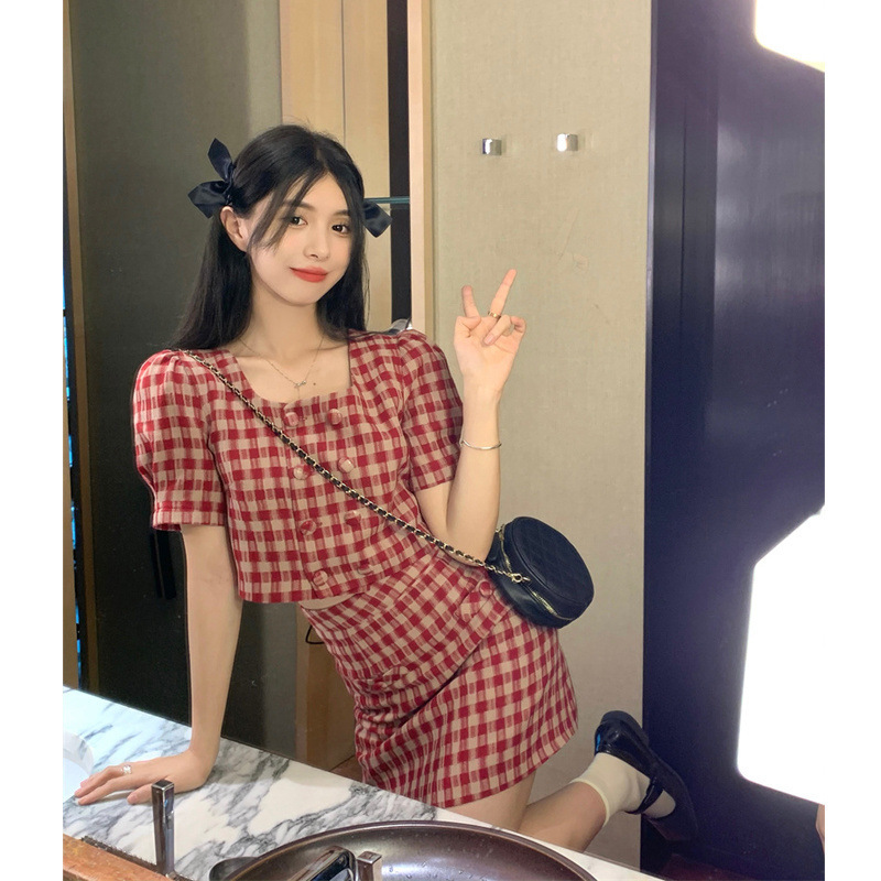 甘くてクールな格子のスーツの女性の春の服の2024の新型の双列のボタンの方の襟の半袖の上着の半身のスカートの2つのセット