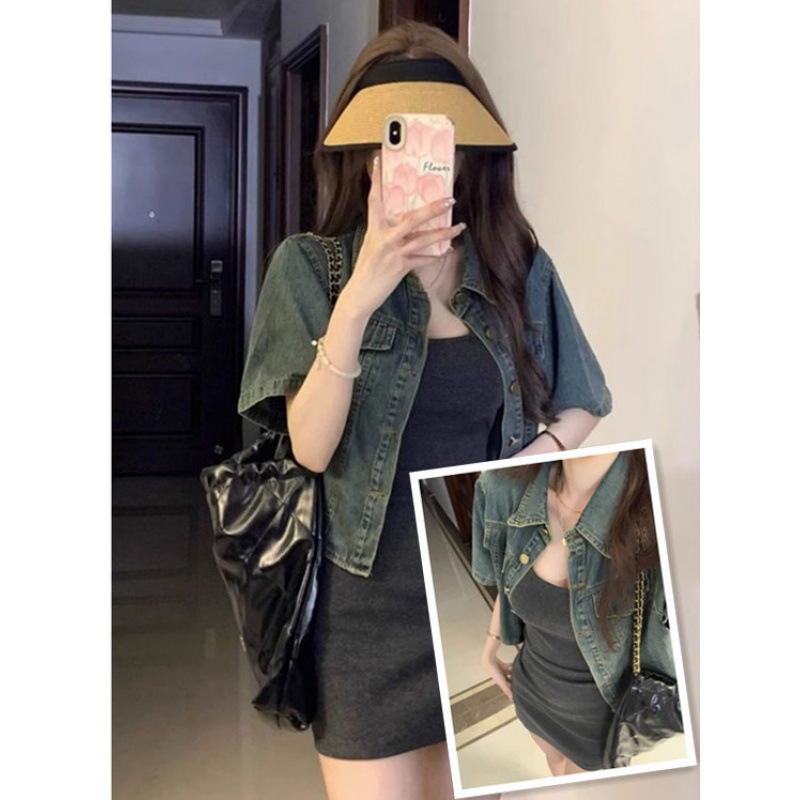 夏の小柄なお茶はデニムのコートを着ています。