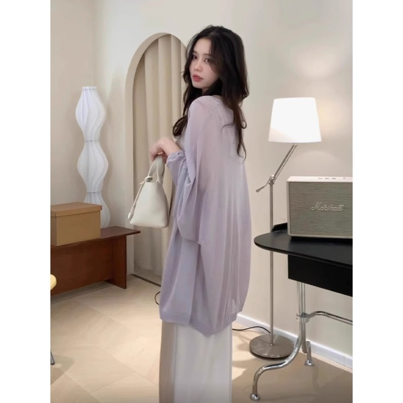 優しい風の紫色の中の長い氷の糸のニットの日焼け止めのカーディガンの女性の夏の薄いタイプのサスペンダーのスカートの外で薄い糸のブラウスを掛けます。