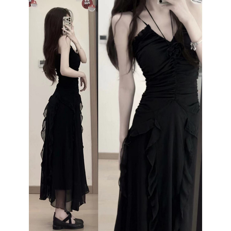 韓国版のレトロな気質の小さい黒いスカートの木の耳元の子供の襟は腰を収めてやせているワンピースの女子学生の夏の字のスカートを現します。