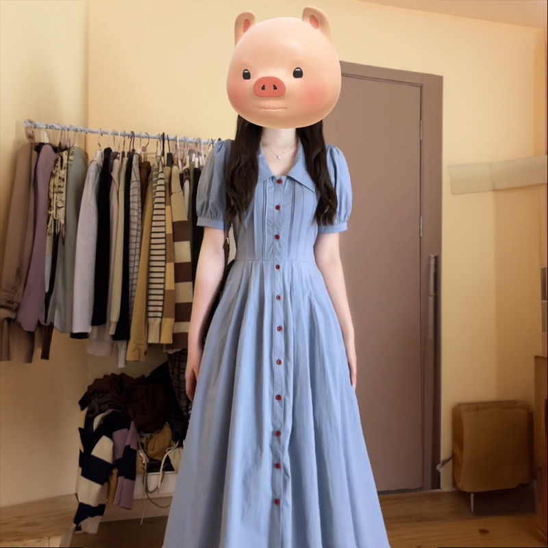 学院の風は腰を収めてやせている青いボタンのシャツのワンピースの2024夏の女子学生の優しい超仙字のスカートを現します。
