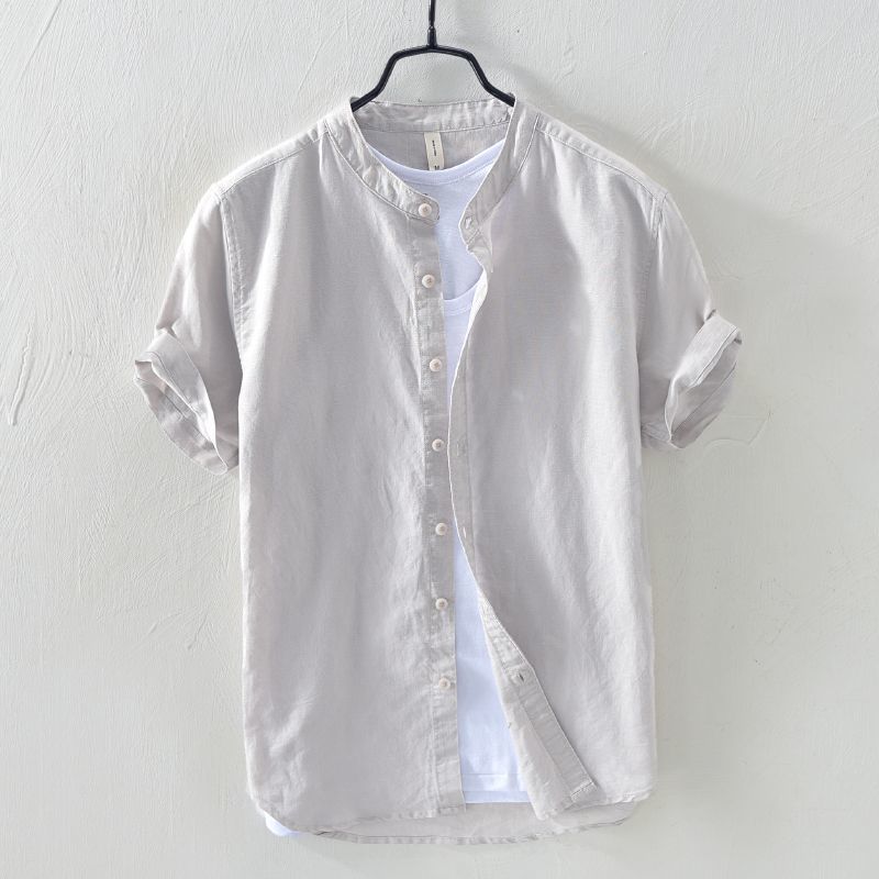 中国風春夏ゆるい高級男性亜麻半袖綿麻カジュアル通気5分半袖シャツ襟シャツ男