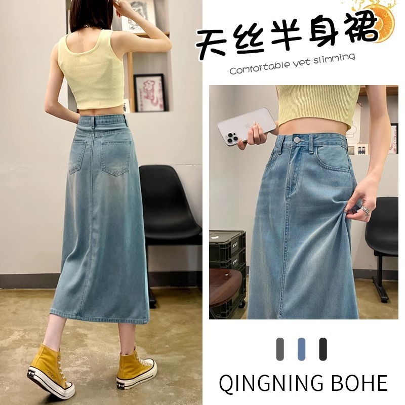 シルクのデニムの半身のスカートの婦人服の夏の薄いタイプのオープンフォークのレトロな高腰の氷の字の中で長いタイプのお尻のスカートを包みます。