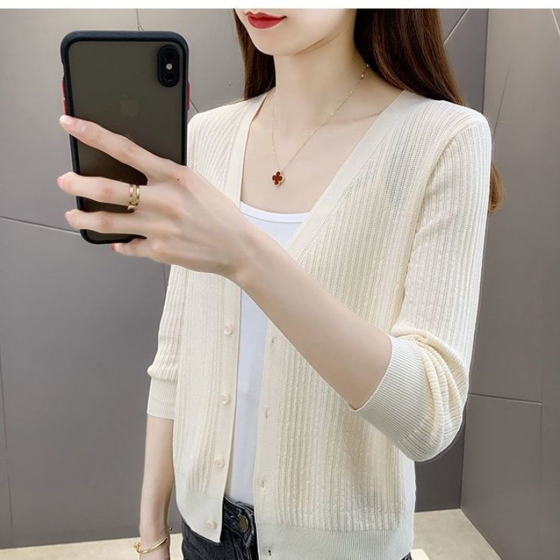カーディガンのニットコートの女性の薄い春夏の氷糸のストールの外に短いタイプの日焼け止めのエアコンのシャツの透かし彫りの上着を掛けます。