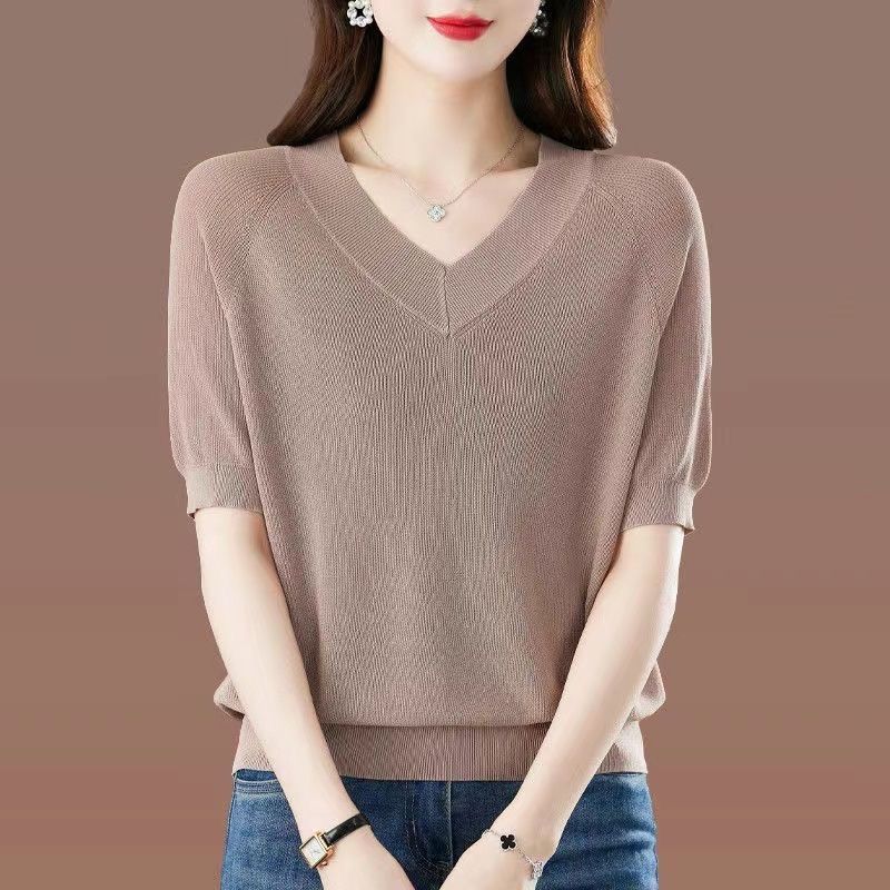 アイス半袖tシャツ女性夏襟中年ママカジュアル上着ゆるい大きいサイズ薄い通気性のあるニット