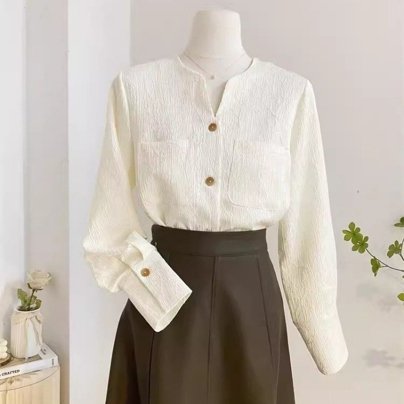 新しい中国式の襟の長袖のシャツの女性の秋のデザイン感の小さい大衆のシンプルな気質の双ポケットのジャカードの小さいシャツの上着
