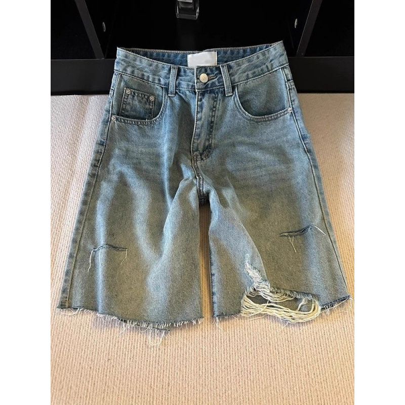 ハイウエストのバリに穴が開いたデニムの半ズボンの女性2025年夏の新型ファッションはやせてゆったりしています。