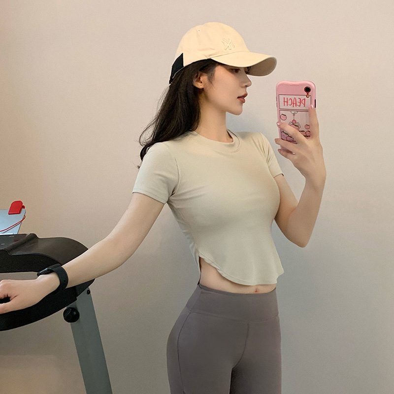 胸パッド付きの薄いスポーツ半袖tシャツの女性のランニング通気性のあるスポーツのフィットネスの上着のダンスのヨガの服の上着の女性