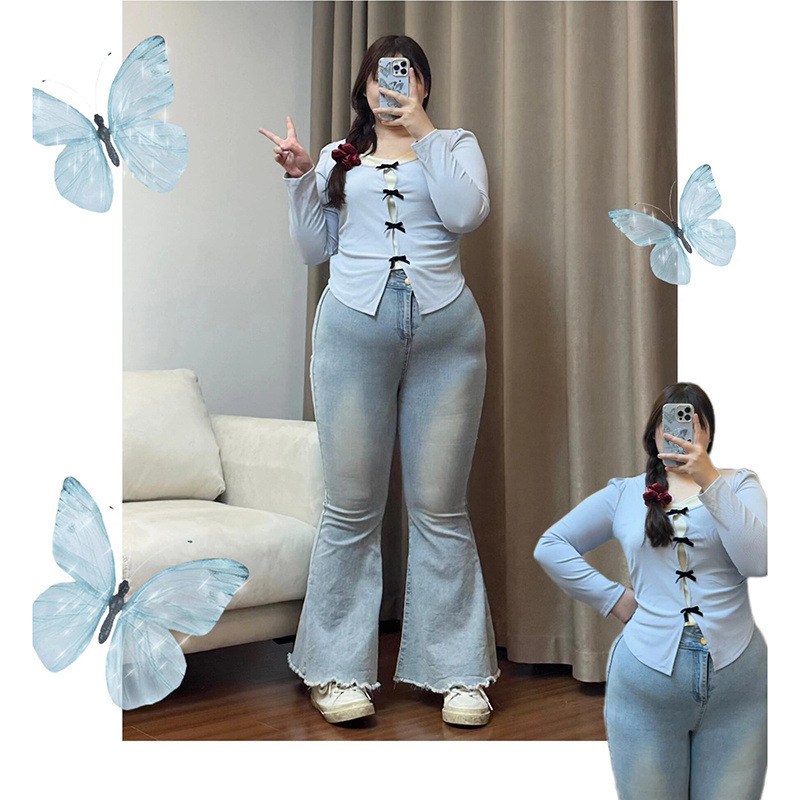 300斤の特大サイズの婦人服のレトロな弾力性のあるラッパのジーパンは太っています。