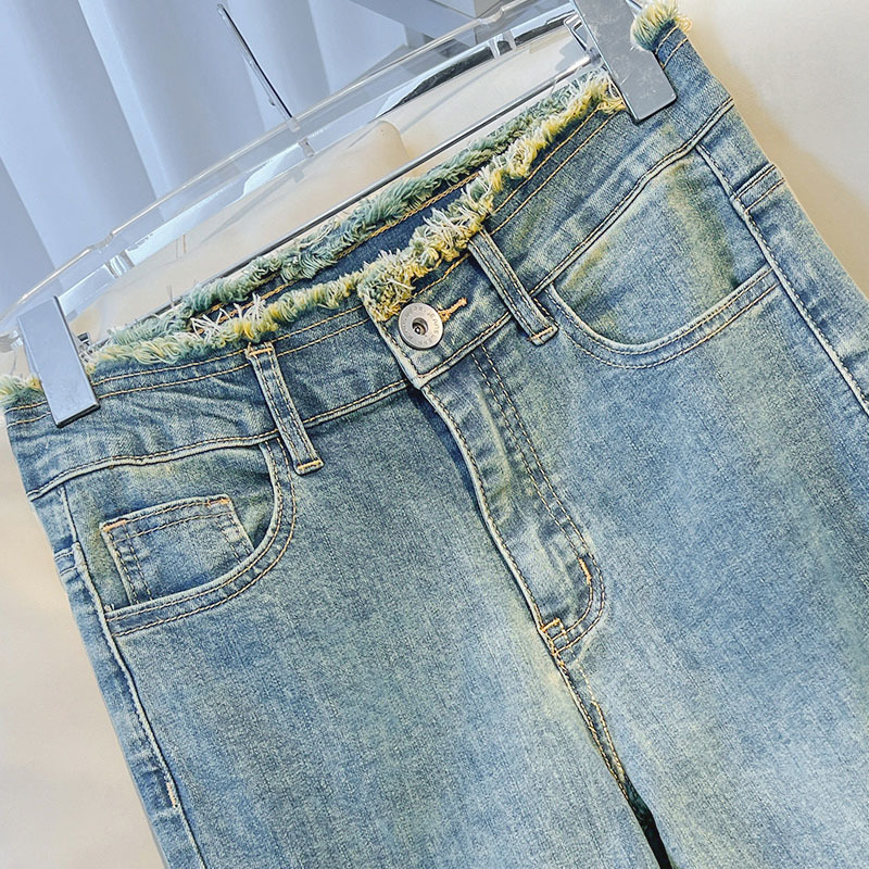 9分の毛の縁のまっすぐな筒のジーパンの女性の薄い金の2024年の韓国版の新型の高い腰はやせている小さい背のタバコの管のズボンを現します。