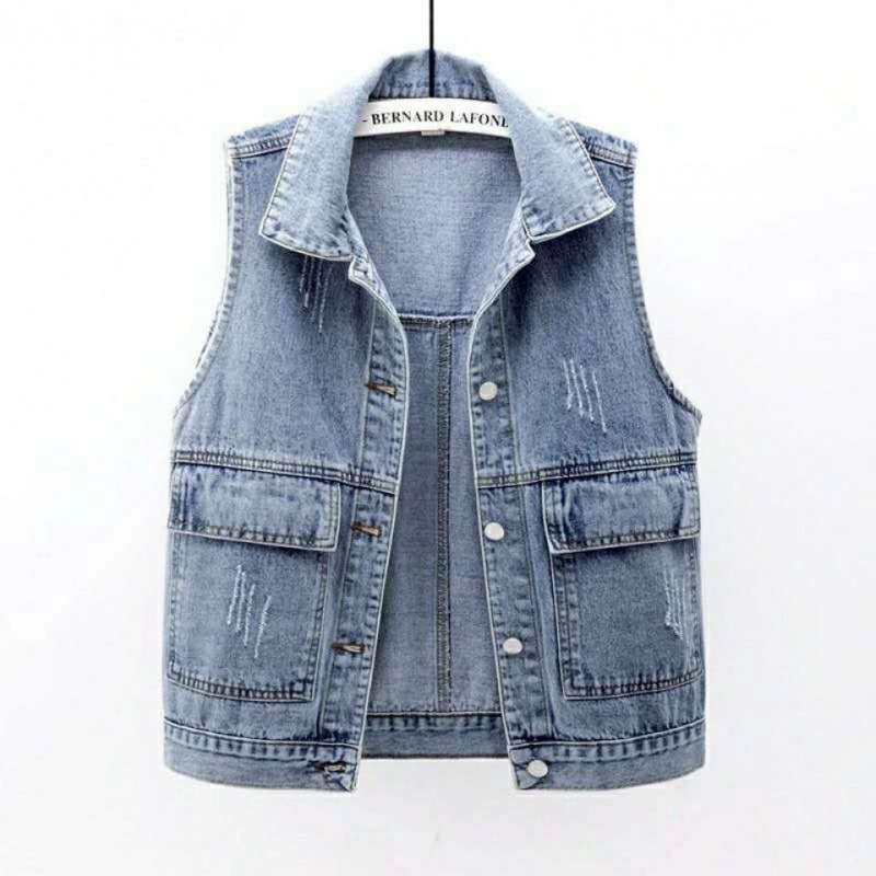 デニムのベスト女性の短いタイプの春夏秋冬のシンプルな大きいポケットのノースリーブのベストの百合のゆったりした上着のカーディガン