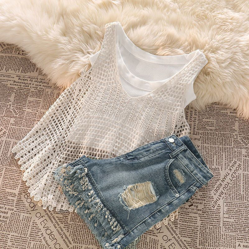 夏の優しさは女性2024の新しい韓国版の透かし彫りの上着を着てベストのデニムの半ズボンの3セットを着ます。