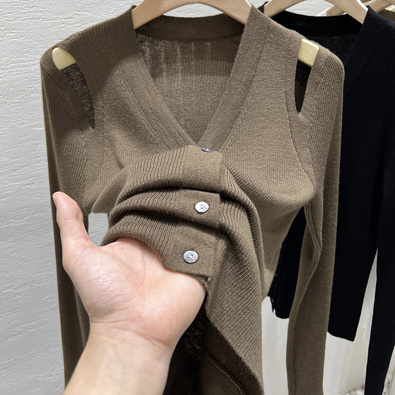 透かし彫りの肩の長袖のニットの女性の2024春秋の新型の薄い金のオーバーの氷の糸のカレーの色のカーディガンの外で上着を掛けます。