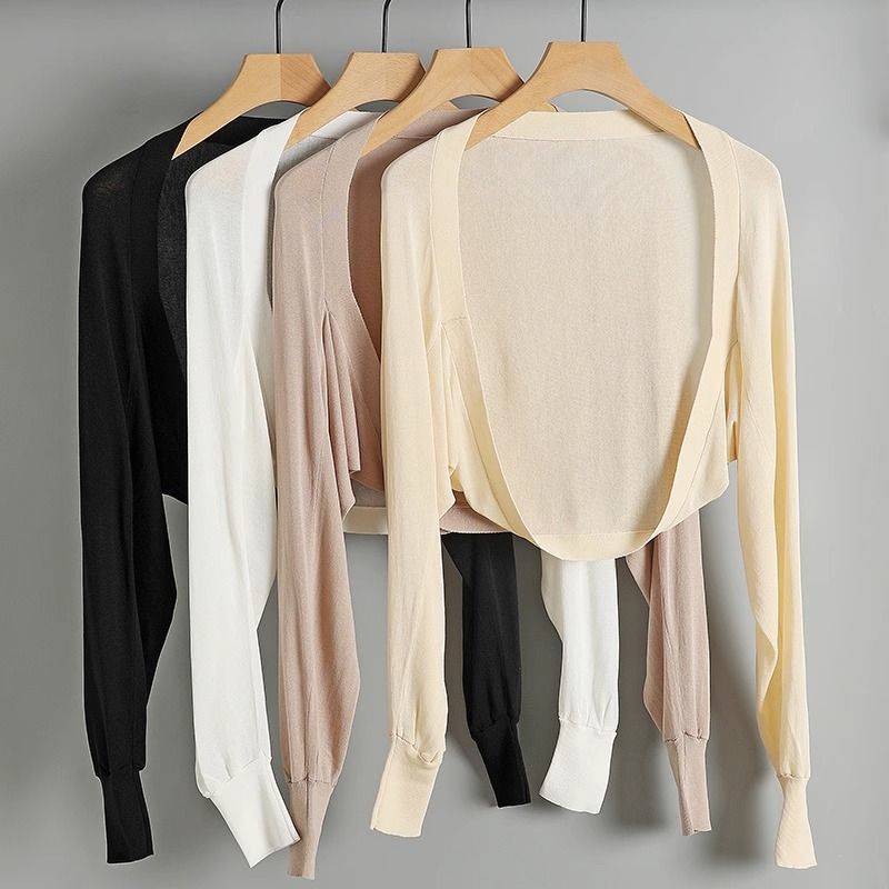 ストールの外は女性の短い長袖の日焼け止めのカーディガンの夏の氷の糸のメリヤスの小さいカンの肩にサスペンダーのスカートのブラウスのエアコンのシャツを配合します。