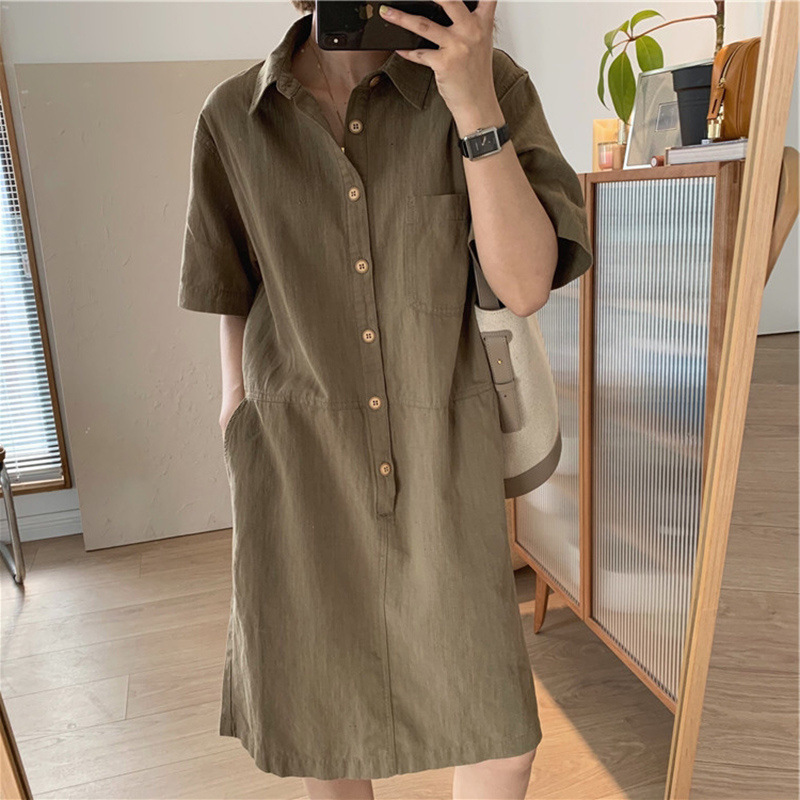 2024新型綿麻シンプル気質カジュアルストレート襟シャツカバー半袖ワンピース綿麻ワンピース
