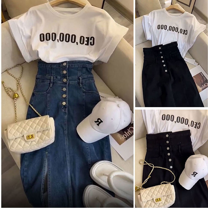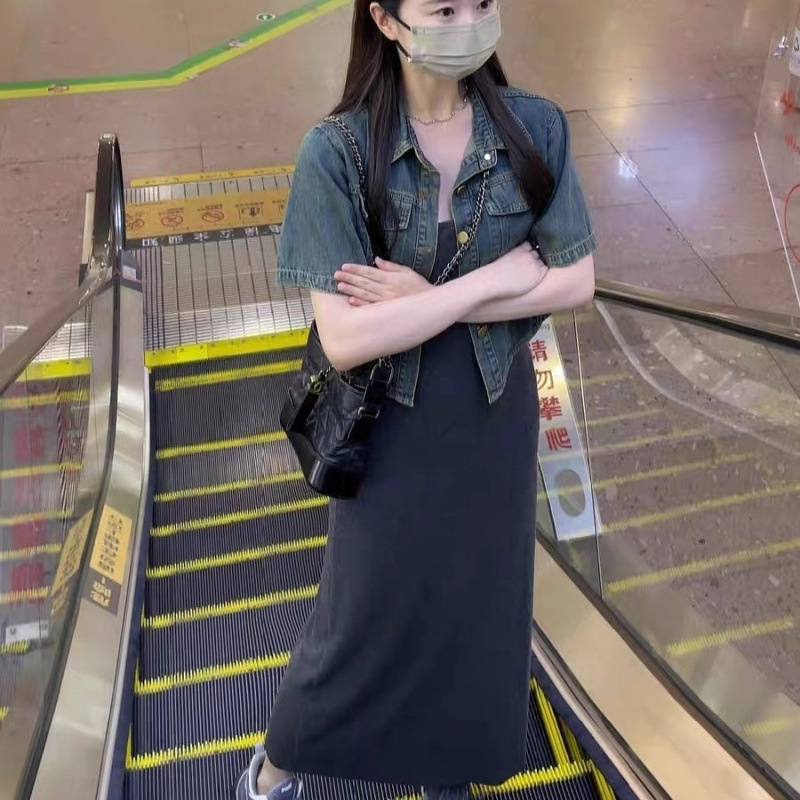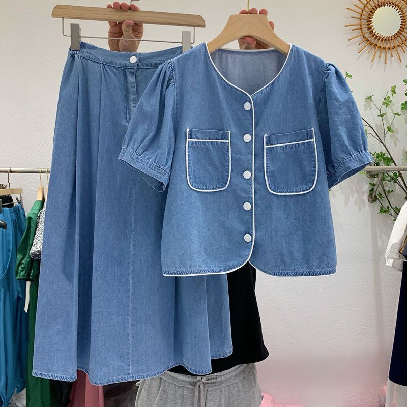 大きいサイズの婦人服のデニムの上着のスーツの2024夏の新型の気質は街を揚げてやせているデニムのワンピースの2つのセットを現します。