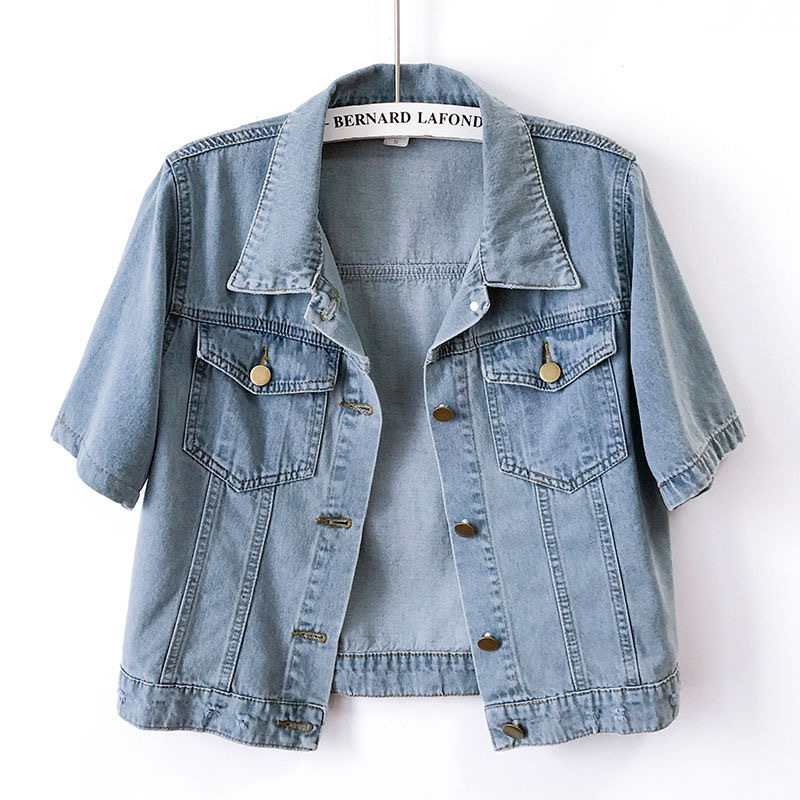 カジュアルな外に明るいデニムのコートを着ている女性2024夏の新しい太った半袖デニムの夏の薄いタイプ