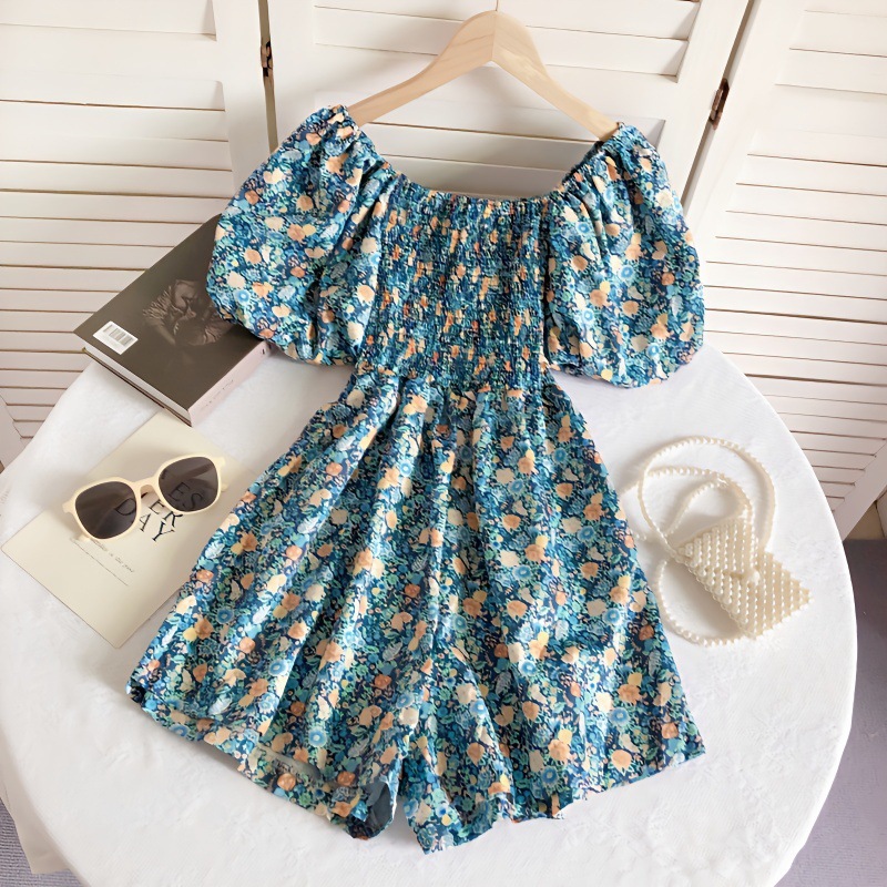 花柄ワンピース レディース 夏 ウエストシェイプ 細見え プリーツ パフスリーブ ワンショルダー ワンピース ショートパンツワンピース 半袖ワンピース