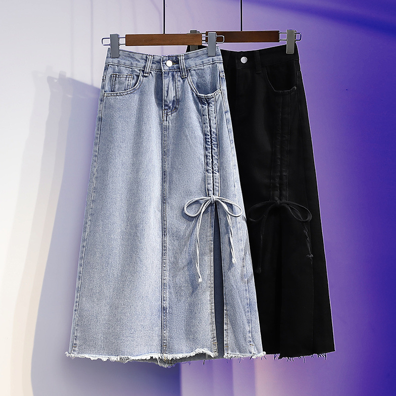オープンデニムスカートの女性は腰が高くてお腹が痩せています。