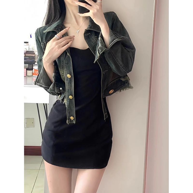 【5499人コレクション】また颯爽セットアメリカレトロデニムジャケットブラックサスペンダーワンピース今年流
